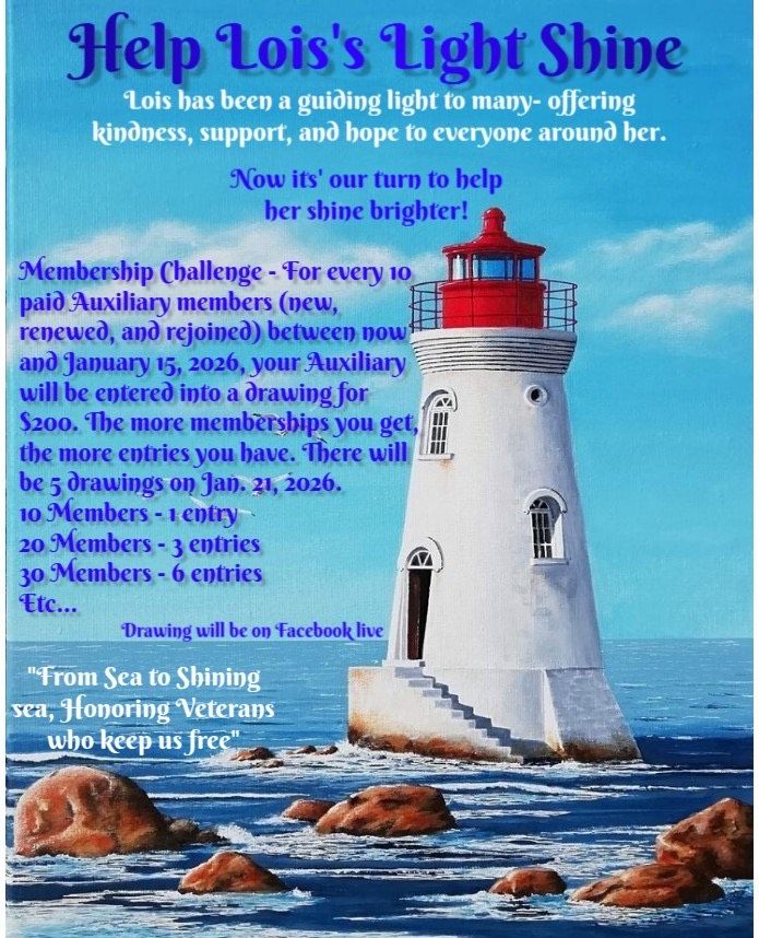 The Challenge: For every 10 paid Auxiliary members (new, renewed, rejoined) between now and January 15, 2026, your Auxiliary will be entered into a drawing for $200. The more memberships you get, the more entries into the drawing for your Auxiliary.